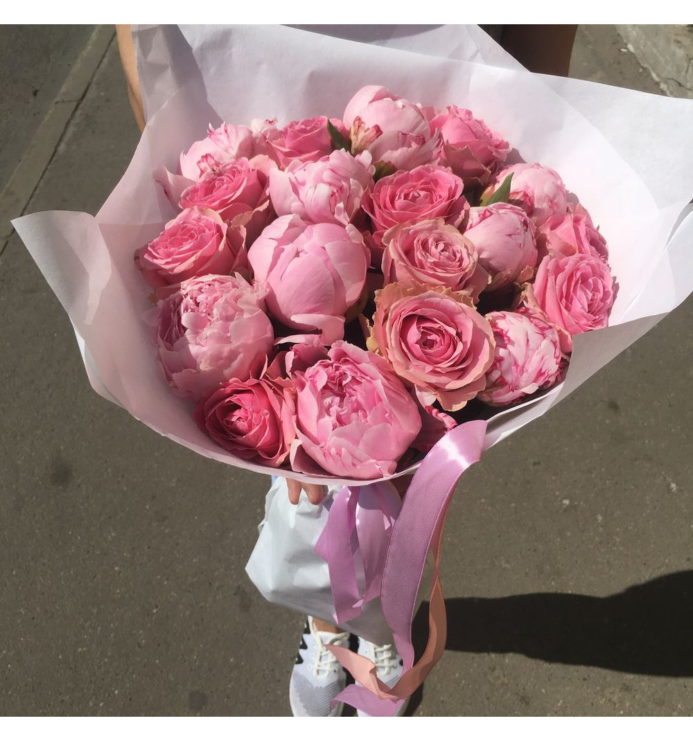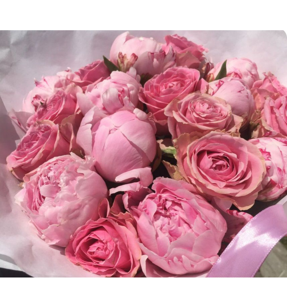 Авторский букет - это уникальное произведение искусства, созданное с любовью и творческим подходом. В этом букете 9 розовых пионов сорта Сара Бернар, которые приносят нежность и изысканность, и 10 роз кенийской сорта длиной 50 см, придающих букету элегантность и роскошь. Украшенный тремя атласными лентами и двумя стильными упаковками, этот букет станет прекрасным подарком для особых моментов и событий в жизни. Подарите этот уникальный авторский букет, чтобы выразить свои чувства и сделать день вашего близкого еще более особенным.