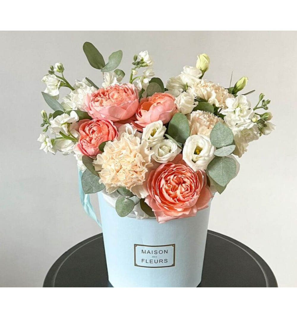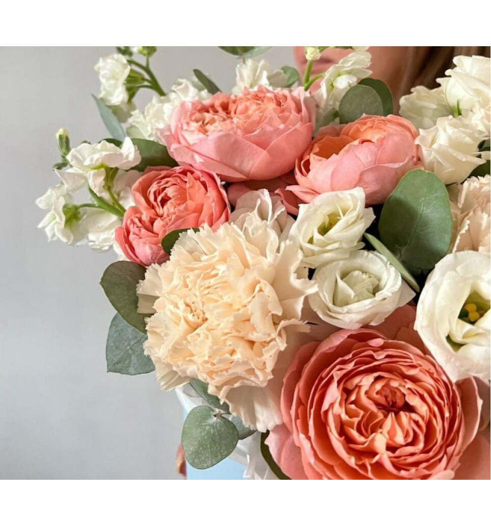Композиция с персиковыми пионовидными розами и маттиолой - это изысканный букет, который воплощает в себе нежность и изысканность. Пионовидные розы своими крупными и пышными цветами напоминают прекрасные пионы, а персиковый оттенок придает им особый очарование. Маттиола, с ее нежным ароматом и утонченными лепестками, дополняет композицию и создает атмосферу роскоши. Этот букет станет удивительным подарком для особых случаев и сделает любой момент в жизни незабываемым.