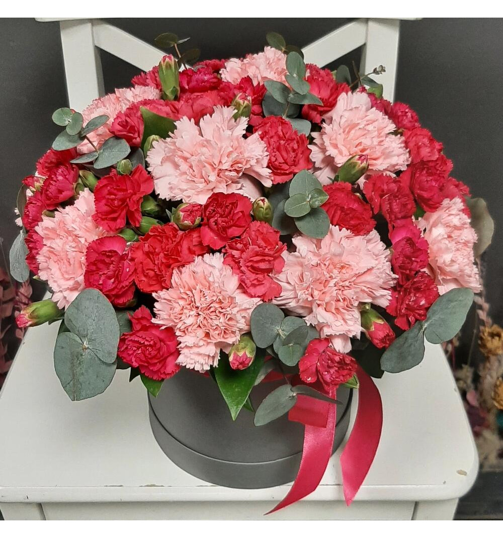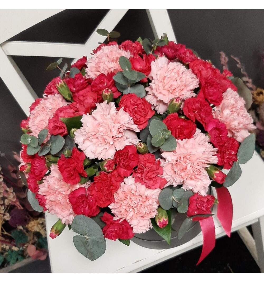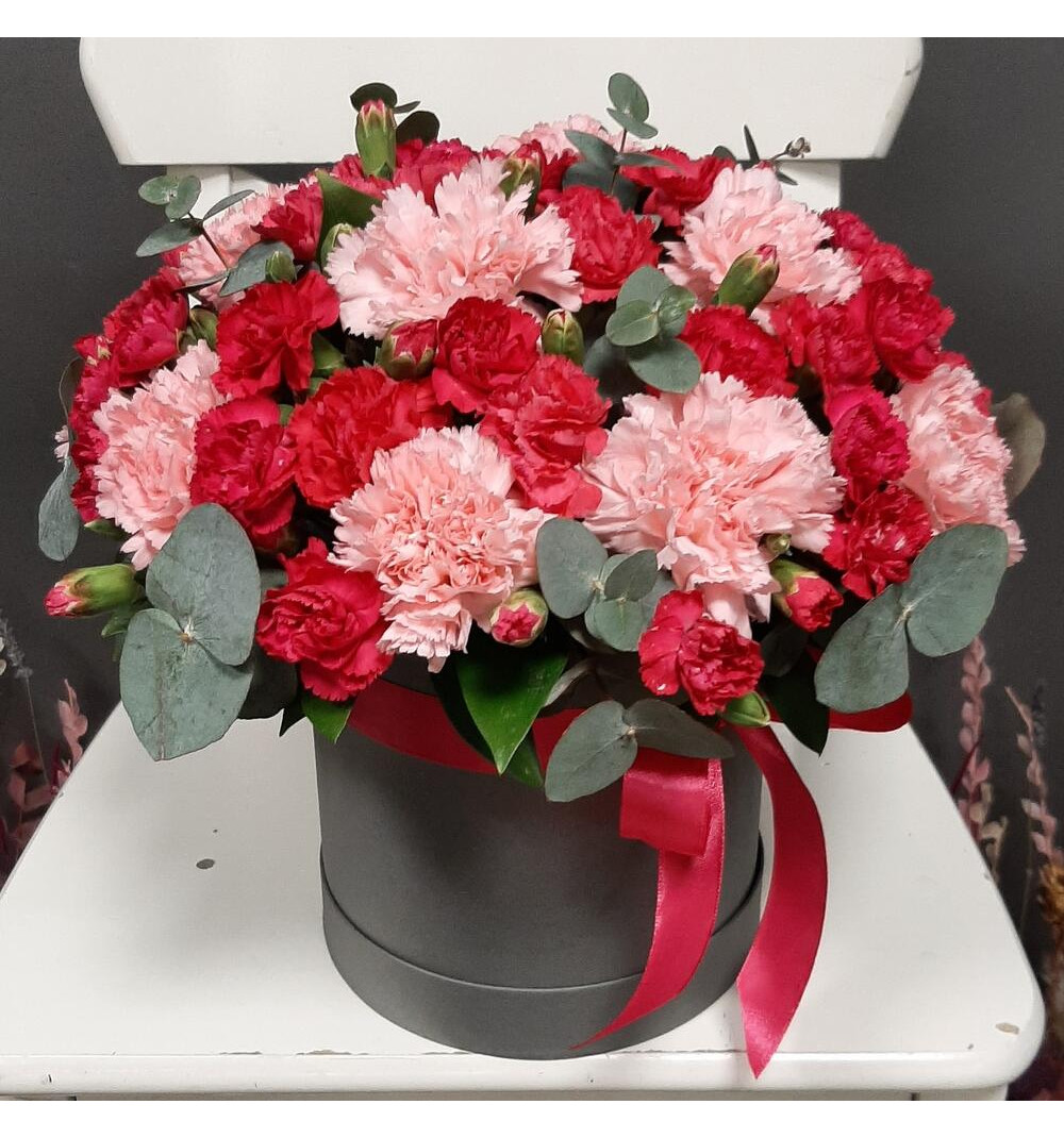 Купить Яркая кустовая и нежно коралловая гвоздика в шляпной коробке в Рудном за 25 000 ₸ | интернет-магазин «Guls»